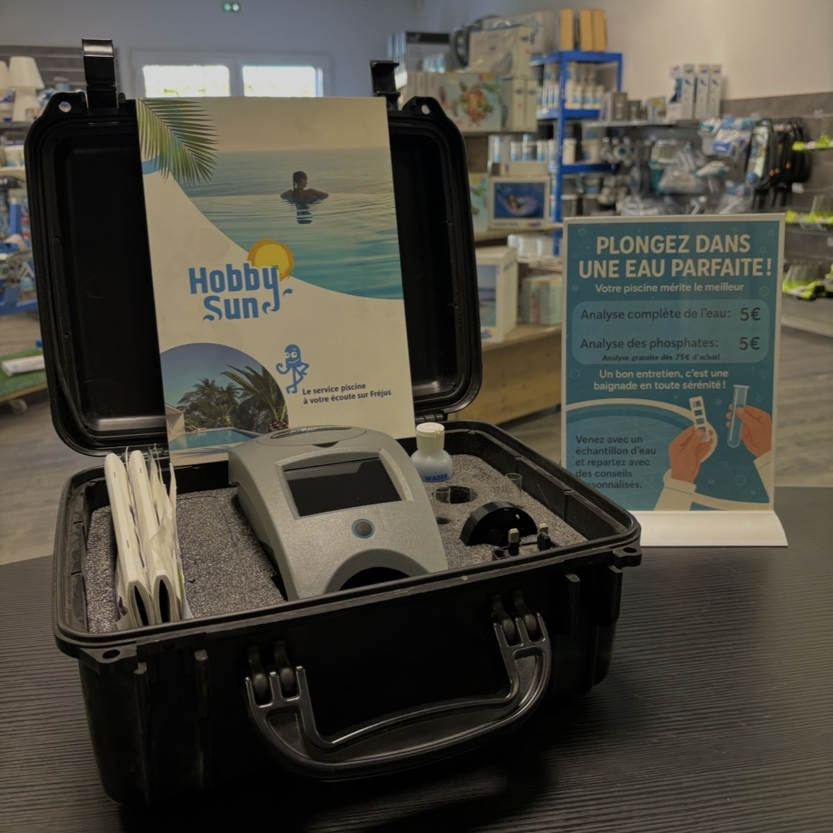 Rendez-vous dans votre magasin Hobby Sun pour une analyse de l’eau de votre piscine et bénéficiez de l’expertise de nos spécialistes.